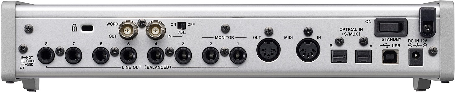 Вывести звук на мониторы можно с помощью восьми линейных выходов, выполненных на разъемах 1/4'' Jack TRS. Два из них являются мониторными. Есть два оптических входа S/MUX на разъемах Toslink, позволяющие реализовать до 16 входных каналов с частотой дискретизации 44.1/48 кГц, до 8 каналов при 88.2/96 кГц и 4 с частотой 174.6/192 кГц. Есть вход и выход Word Clock с разъемами BNC, служащие для синхронизации аудиоинтерфейса с другими устройствами. Наконец, имеется MIDI-интерфейс с входом и выходом на стандартных 5-контактных разъемах для подключения различных MIDI-клавиатур, сэмплеров, синтезаторов и других приборов, работающих по MIDI. Энергообеспечение происходит от адаптера 12V DC, а коммутация с компьютером осуществляться посредством порта USB-B.
