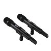 Ручные передатчики в прочном металлическом корпусе представляют собой динамические микрофоны с кардиоидной диаграммой направленности. Такая конструкция эффективно отсекает посторонние шумы и снижает вероятность возникновения обратной связи. На корпусе расположен ЖК‑дисплей, отображающий уровень заряда батарей и рабочую частоту, а также ИК‑порт для синхронизации с приёмником. Питание микрофонов осуществляется от двух батареек типа АА, обеспечивающих до 8 часов непрерывной работы.